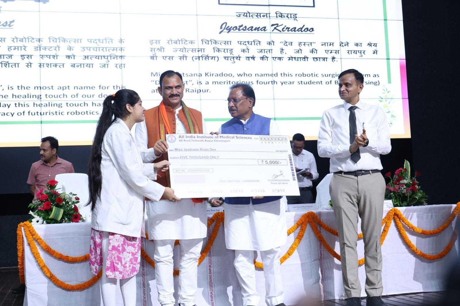 बी.एससी. नर्सिंग की छात्रा सुश्री ज्योत्स्ना किराड़ो को इस प्रणाली का नाम “देवहस्त” देने हेतु सम्मानित किया गया।