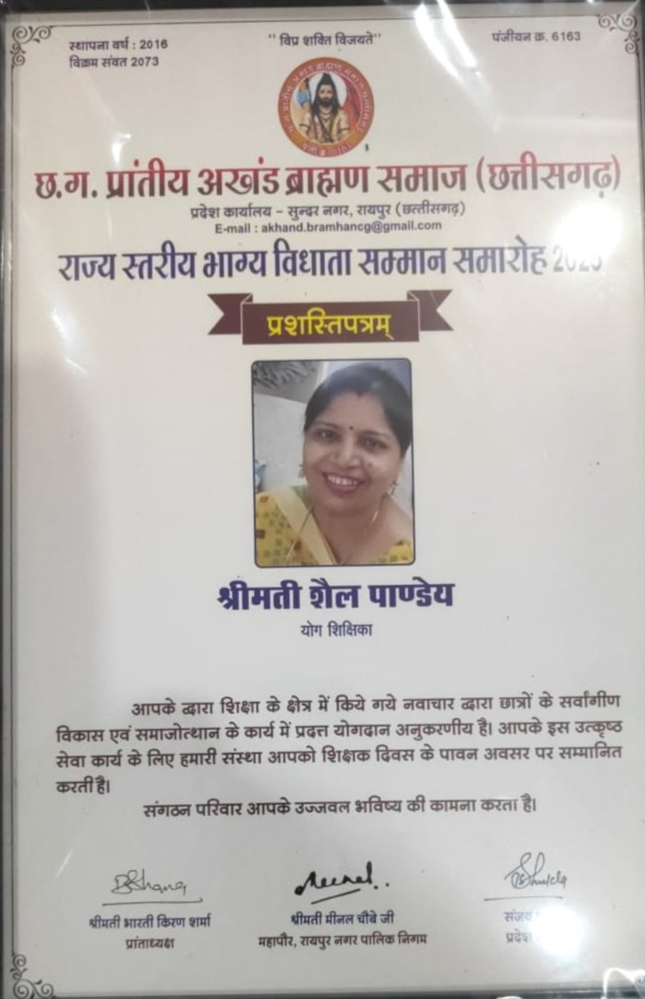 सम्मान समारोह सिविल लाइन, वृंदावन हॉल में आयोजित किया गया । छत्तीसगढ़ प्रांतीय अखंड ब्राह्मण समाज( छ ग ) सुंदर नगर, रायपुर द्वारा सम्मान समारोह का आयोजन किया गया ।श्रीमती शैल पाण्डेय ने कहा कि योग एक संपूर्ण जीवन जीने की कला है , नियमित योगाभ्यास से बीमारियां दूर रहती हैं और रोग प्रतिरोधक क्षमता बढ़ती है । योग हमें शारीरिक फिटनेस के साथ-साथ मानसिक और आध्यात्मिक संतुलन प्रदान करता है ।